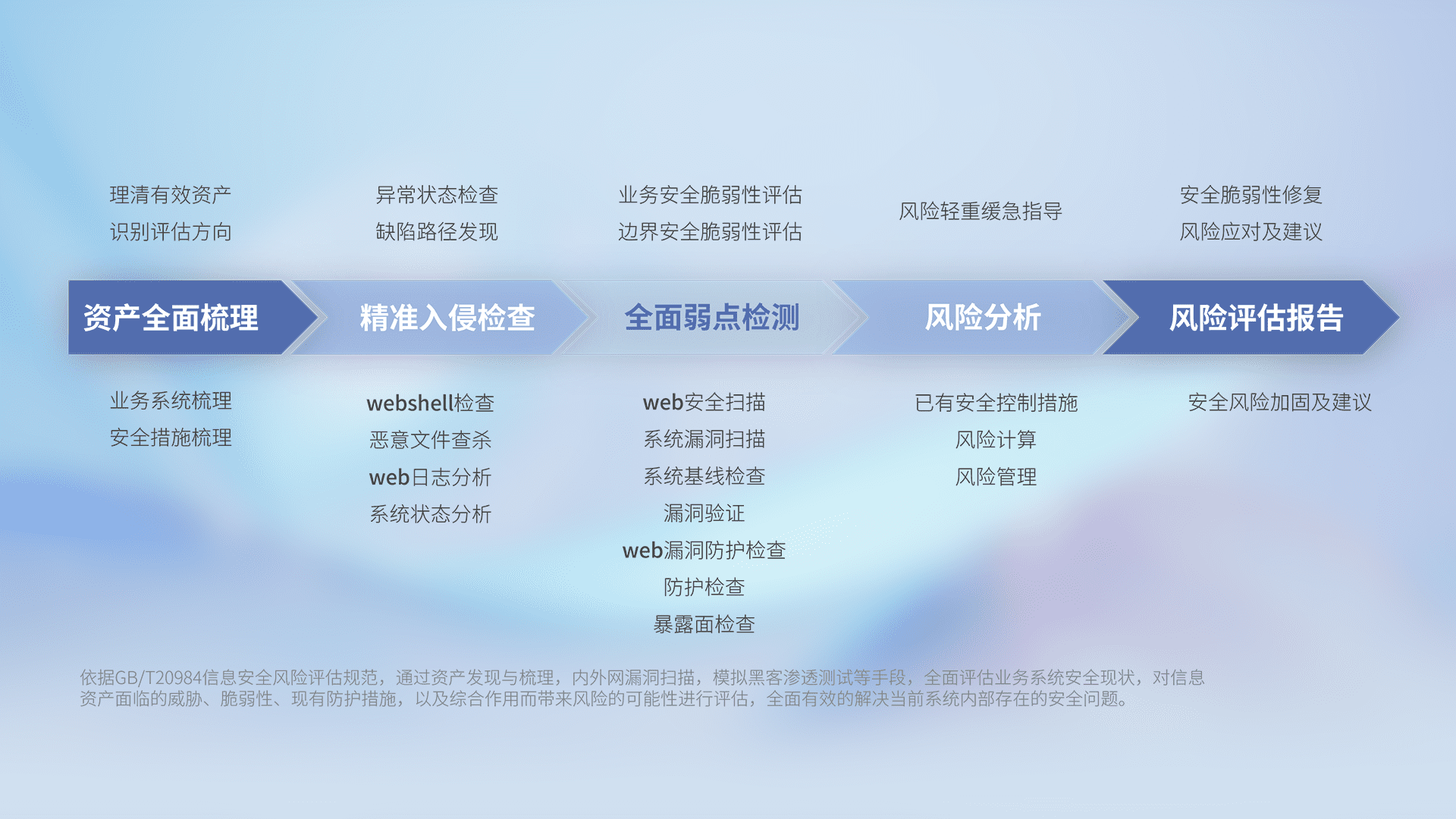 针对客户行业特性,,以专业的安全服务+多厂商联合解决方案提供专属的一站式安全管理服务,,,帮助客户全面感知网络空间威胁,,,基于识别、、检测、、、分析、、防护、、、、监测、、响应的服务理论模型,,从方案咨询、、集成交付、、、、评估验证、、、、优化加固、、、、运维运营,,,致力于为客户提供完整的闭环管理式安全服务。。。以实战经验为客户打造高抵御风险的安全体系,,帮助客户发现威胁、、、、对抗威胁、、、处置威胁,,,,不断积累安全对抗能力,,,持续保障数字化安全。。。